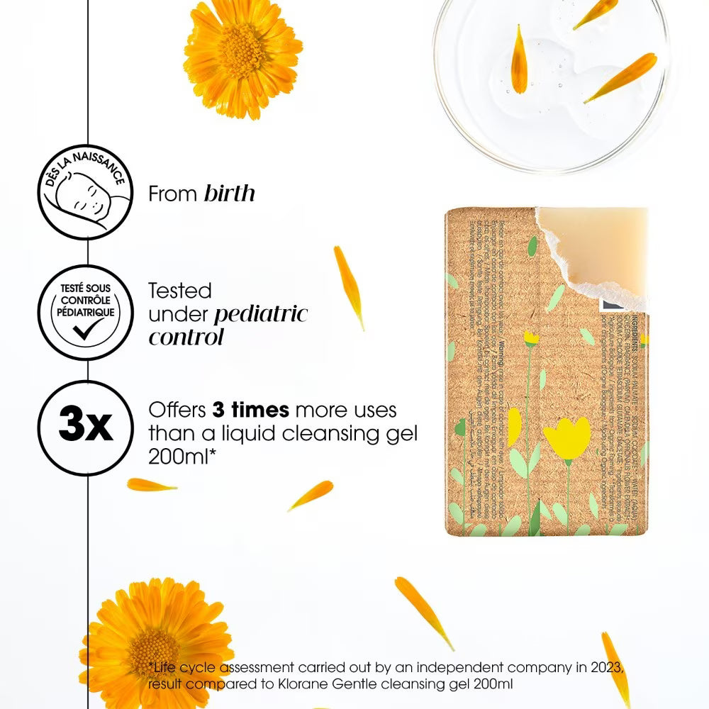 Klorane Bébé Savon Surgras Doux au Calendula gently cleanses newborn and baby skin on the face and body without irritation or dryness. Enriched with Calendula extract from organically grown flowers and Camelina sativa seed oil, this soap bar soothes, protects the hydrolipidic film, and maintains skin comfort. Composed of 97% natural ingredients, its hypoallergenic, biodegradable formula is tested under pediatric supervision, making it safe for daily use from birth. The delicate, relaxing fragrance enhances every bath, while the environmentally friendly composition supports gentle care for sensitive or normal skin.