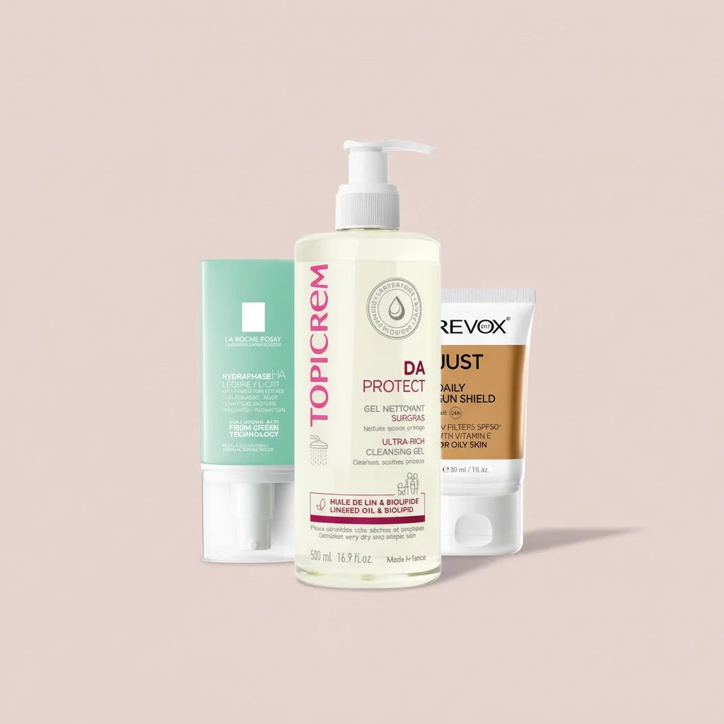 Complete daily skincare bundle for men with dry and very dry skin designed to deliver gentle cleansing, long-lasting hydration, and high sun protection. This dermatologist-tested routine combines Topicrem DA Protect Ultra-Rich Cleansing Gel, formulated to cleanse very dry and atopic-prone skin without stripping or irritation, La Roche-Posay Hydraphase HA Légère Moisturizer, a lightweight yet intensely hydrating cream enriched with hyaluronic acid to restore comfort and suppleness, and Revox B77 Just Daily Sun Shield SPF 50+, providing broad-spectrum UVA/UVB protection in a fast-absorbing, non-greasy formula. Ideal for daily use, this bundle helps maintain healthy, comfortable, and protected skin.