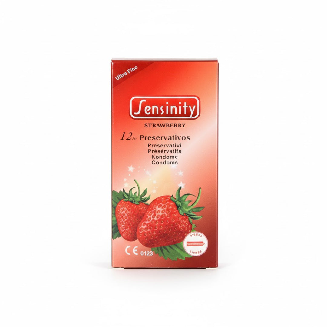 Sensinity Ultra Thin Ribbed Condoms Strawberry 12 Pack Lubricated