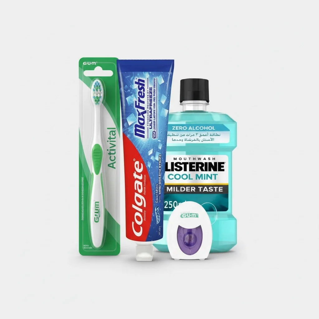 Complete daily oral hygiene and fresh-breath bundle designed to deliver thorough cleaning, interdental plaque removal, cavity protection, and long-lasting freshness. This expertly curated set combines the GUM Activital 583 Medium Manual Toothbrush with an ultra-compact head for precise cleaning, Colgate Max Fresh UltraFreeze Toothpaste to help fight cavities while delivering an intense cooling sensation, GUM Expanding Floss for effective interdental plaque removal, and LISTERINE Zero Mouthwash, an alcohol-free formula that provides a refreshing minty finish without burning. Ideal for daily use, this bundle helps maintain a clean mouth, healthy gums, and a fresh smile.