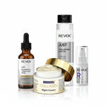 Ultimate Anti-Aging Skincare Pack designed to support deep hydration, antioxidant defense, and visible signs of aging for all skin types. This comprehensive routine combines Revox B77 Just Hyaluronic Acid Hydrating Face Wash to gently cleanse while maintaining skin comfort, Revox B77 Just Resveratrol + Ferulic Acid Serum to deliver powerful antioxidant protection against environmental stressors, Revox B77 Retinol Eye Contour Gel to target fine lines and wrinkles around the delicate eye area, and Revox B77 Collagen Night Cream to provide intense overnight hydration and support skin elasticity. Ideal for nightly use, this bundle helps restore, nourish, and rejuvenate the skin while you sleep.