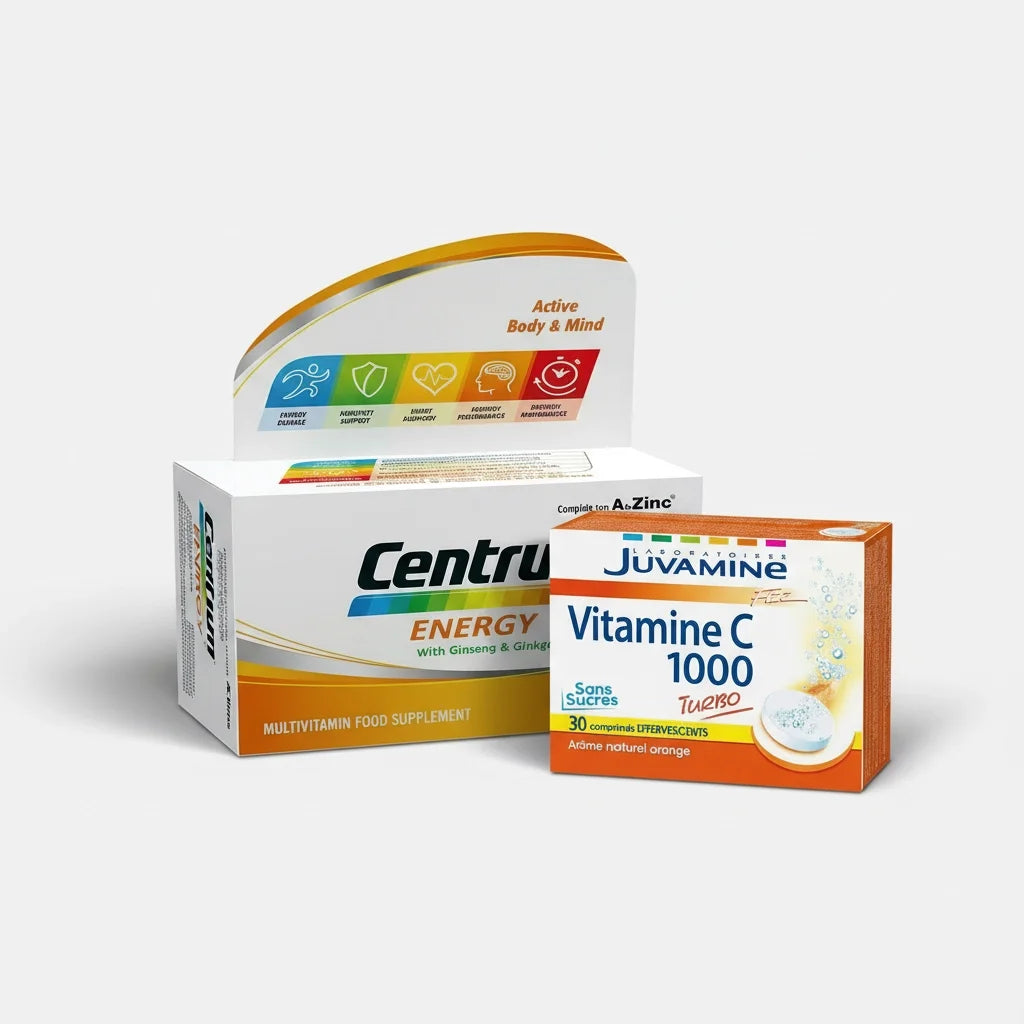 Daily energy and vitality wellness bundle designed to support physical energy, immune defense, and overall well-being for active adults. This energizing routine combines Centrum Energy Multivitamin Tablets, formulated with essential vitamins, minerals, ginseng, and ginkgo biloba to support daily energy, mental focus, and general health, with Juvamine Vitamin C Effervescent Tablets, delivering a refreshing dose of vitamin C to help reduce fatigue and support immune function. Ideal for everyday use, this bundle provides a simple and effective approach to maintaining vitality and balance.